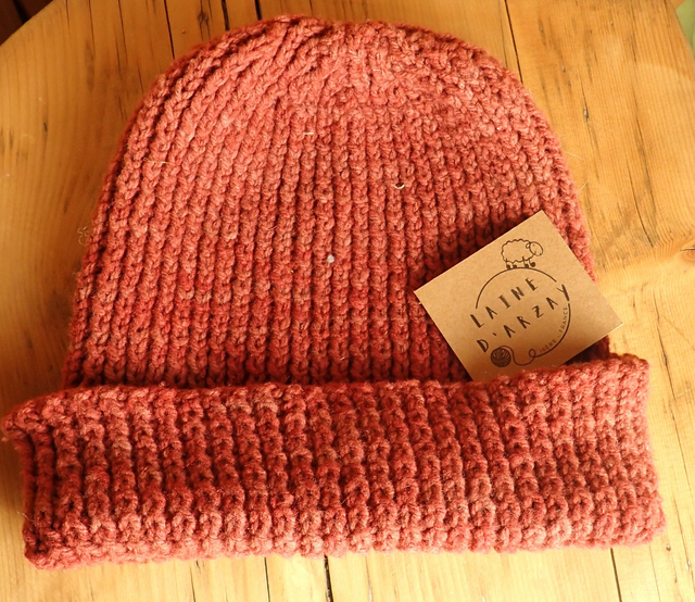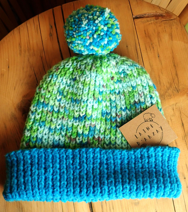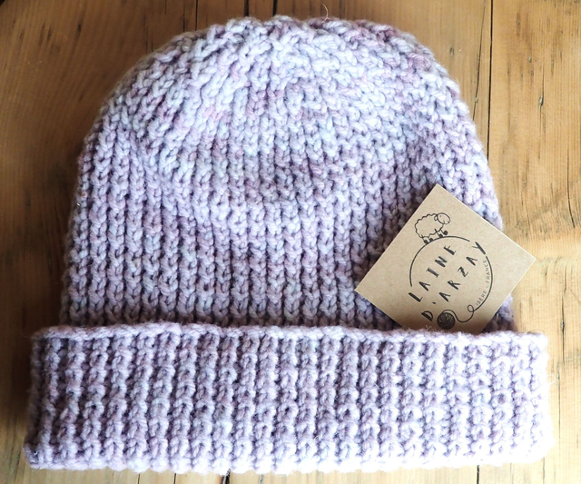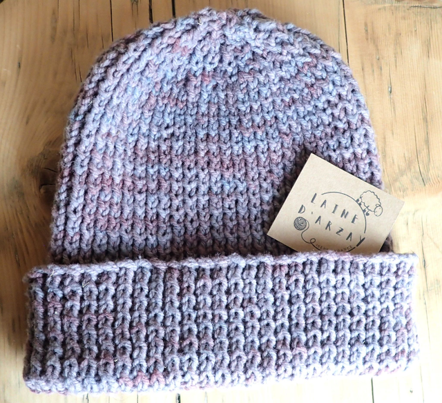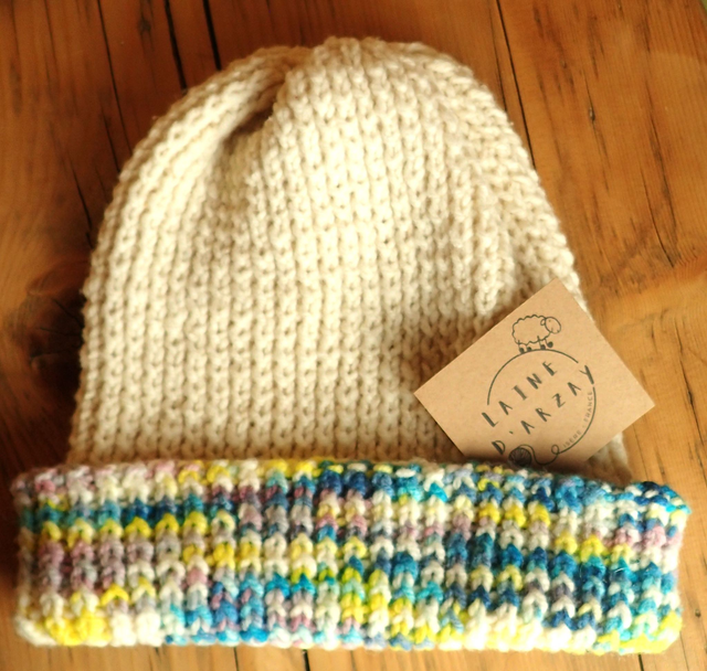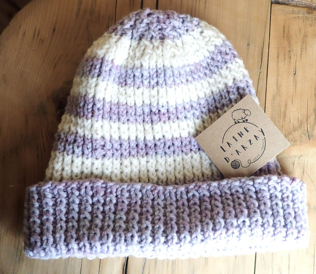 La laine et le point du tricot sont extensibles. Le bonnet s'adapte donc bien à ta taille.