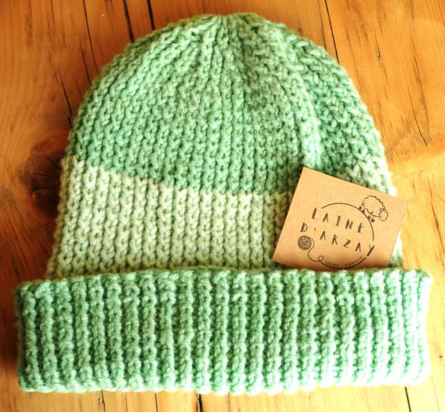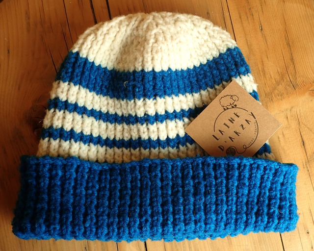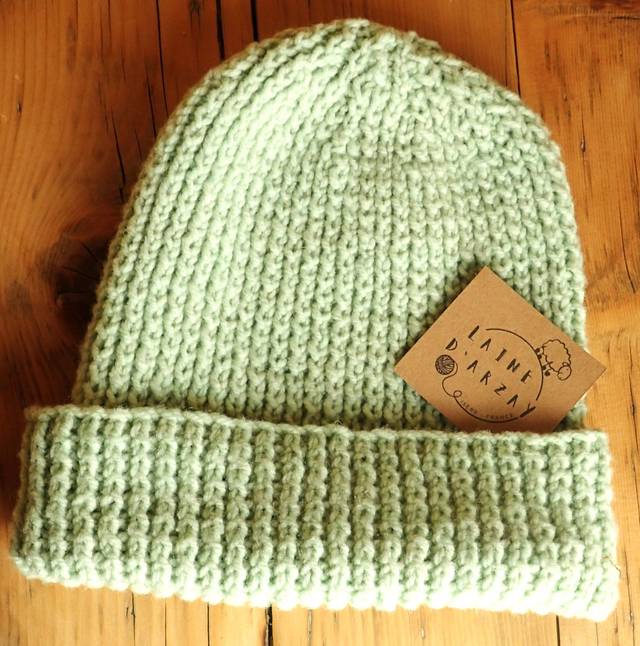 Tout nos produits sont tricotés à la main avec notre fil mérinos. Il s'agit de la laine mérinos de nos brebis, lavée, cardée et filée en France.