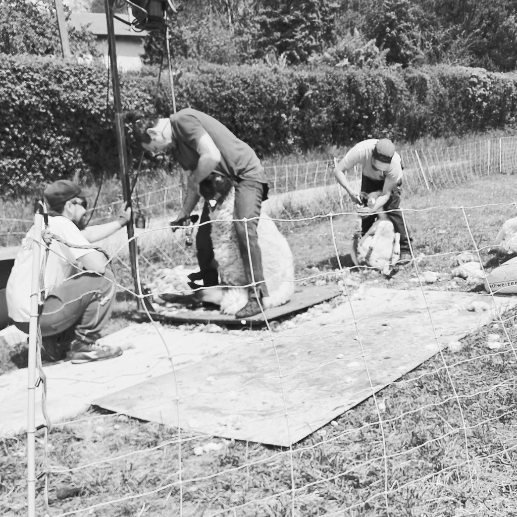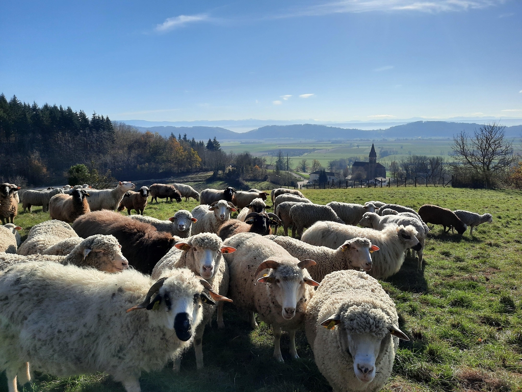 Nous sommes éleveurs de brebis à Arzay, dans le nord Isère. Nous valorisons la laine mérinos de notre troupeau en la transformant en fil et en produits finis, tricotés à la main. Les laines non mérinos sont quant à elles transformées en feutre.