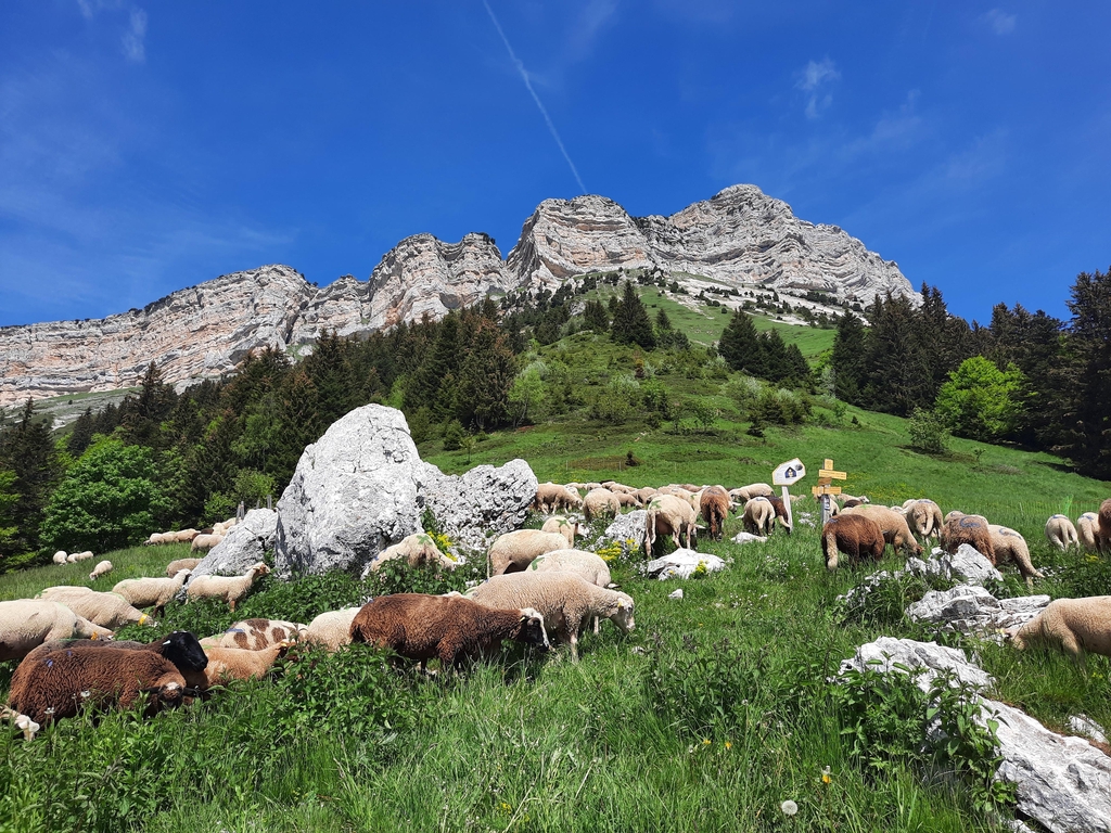 Notre troupeau pâture en extérieur presque toute l'année : l'été en alpage sur Chamechaude, en Chartreuse, le reste du temps sur les prairies autour de la ferme. Les agneaux sont élevés exclusivement au lait maternel et à l'herbe, sans complément alimentaire dans le respect du cycle naturel des brebis.